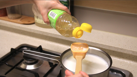 냄비에 우유를 붓고 잘 저어주면서 끓이다가 기포가 올라오면 식초 1스푼을 넣어주세요~