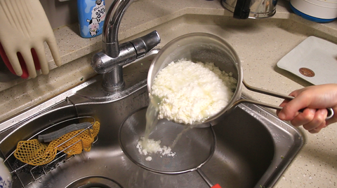 우유가 순두부처럼 몽글몽글 해지면 체에 걸러서 물기를 꽉꽉 짜주세요!!