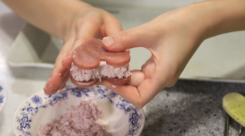 오븐에 잘 구워졌으면 만들어둔 속재료와 함께 마카롱 모양을 만들어주세요!