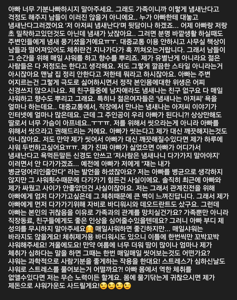한 두달전쯤에 전자기기 사는일로 아버지랑 다툼이 있었어요. 결국 아버지 말대로 사게되며 일단락 되었고 저는 아버지랑 화해하고싶어서 먼저 다가가려하는데... 그 체취가 벽입니다..