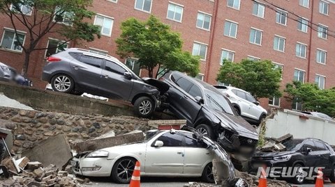 이 사고로 담장이 무너지고 근처에 세워진 차량 5대가 파손됐다.