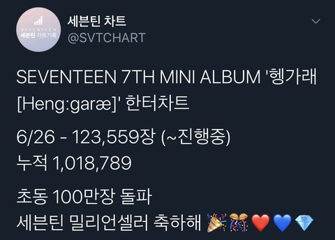 라이트로 파다가 홈때부터 깊게 팠는데 그때 초동 30만장 터져서 거의 팬들끼리 파티 분위기였는데 언제 백만장 찍었어ㅠㅠㅠㅠㅠ많이 컸다 세븐틴