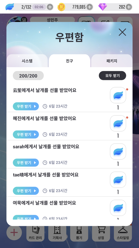 친구 100명까지만 추가할수있는거 아니야..?어떻게 200개를 보내징..?그리구 날개 하루에 50만 받을수있는거지?ㅜ점점 쌓여감..