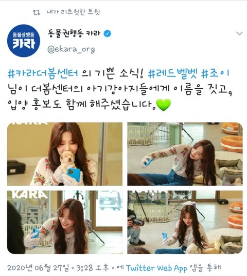 조이가 개훌륭 촬영하고 강아지 입양센터에도 직접 들려서 예정에 없던 인스타라이브까지 켜서 입양홍보 해줬대 덕분에 입양문의가 많이 들어오구 있다함! 얼굴만큼 마음씨도 예쁨bb