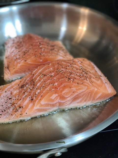 끄신 상태에서 그 녹은 버터기름을 연어 위에 계속 끼얹어 주세요!(아로제) 그러면 위에부터 또 익게되고, 딱 적당한 미디움으로 익게 되는것 같아요.