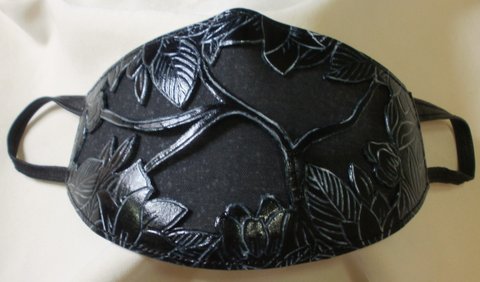 가죽에 곷과 잎 디자인을 판화기법으로 카빙하고 천연염색하여 일반 마스크를 간편하게 탈부착할 수 있도록 제작한 가죽 패션마스크입니다.(마디샤)