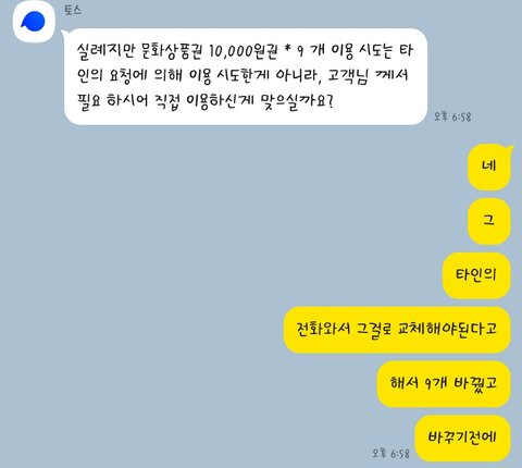 카카오뱅크 카드가 있냐는데 자취방이라서 지금 없다니까 그럼 신한카드로 다옮기래 여기서ㅈㄴ웃긴건 카뱅에있는 6백원도 옮겨요..?ㅋㅋㅋㅋ 이랬는데 그건 필요없대 __럼이. 얘들도 600원따위는 필요없다눈거지,, ㅋ ㅋ 아 네.. 하고 동아리돈 14만원만 옮겨서 16만원이됐음 그걸이제 협약맺은 업체로 돈을 보내야된는데 페이앱같은거있냐는데 카카오페이밖에 안써서 ㅈㄴ 무안할정도로 말하는거마다 다 없다햇음 그러다가 토스가입돼있냬 가입은되어있는데 안쓴다고 깔아야된다했더니 앱스토에 들어가서 토스를 깔으래 깔았음 거기에 신한카드가 연결이돼있냬 모든돈을 토스머니로 옮기래 뭔가 이때부터 ㅅㅂ 조카이상한거야 의심은 조카가는데 앞에서 밑밥깔아둔게 졸라 완벽하다생각해서 긴가민가하면서 속으론 ㅅㅂ 이거 보이스피싱이면 ㄹㅇ_되는데 하면서 내성격이 개 찐따병따년이라 아저씨 보이스피싱이죠! 이 샤발련아! 이런 말도못하고 그냥 진행했음 근데이걸 ㅅㅂ 문화상품권으로 바꾸라는거야 이때 부터 와 이건진짜 아닌거같은데라는 생각이듦 왜냐면 며칠전에 우리아빠도 상품권으로 바꿔서 보내라는 보이스피싱에 당할뻔해서 이건 아니다 생각하면서도 난 짠따병따니까 아무말못하고있었음 상품권 9만원으로 바꾸라는데 이게 만약 안되면 내 계좌 거래역중에 불법거래가 걸리는게있어서 그러는거다라고 밑밥을 깜 근데 다행이도 토스에서 뭔가 위험을 감지했는지 내 계정을 막아버렸음 ㅠㅠㅠㅠ 쉬이발 토스만세ㅠㅠㅠ 지금까지 진행을 잘하고있는지 확인차에 간간히 화면을 캡쳐해서 보냈었는데 안바꿔진다니까 캡쳐해서 보내래 보더니 뭔가 불법거래내역이 감지돼서 그런거라고 토스 소장님이랑 연락을 하고오겠다 끊지말고있어봐라 하는시간에 ㅈㄴ 몰래 가족톡에 대구경찰서에서 전화왓는데 이거 사긴지진짠지 모르겠다ㅠㅠㅠ어떡하냐ㅠㅠㅠ 이지랄하면서 아 이거진짜면 가족한테도 말하지말라했는데 진짜면 어떡하지ㅅㅂ ㅠㅠ 이 쓸데없는 버러지같은 걱정하면서 손발발떨면서있었는데 거기서 먼저 전화를 끊어버렸음 그리고 그후로 전화가없으니까 그때서야 이건진짜다 티비뉴스에서만 듣던 먼나라얘기로만 알았던 보이스피싱이 진짜 나한테서 일어난것이다 그때서야 깨닫고 손가락 발발떨면서 토스에 돈 잘있나 확인하려고 들어갔는데 안들어가져서 아거진짜 _됐다 그자칭 검사년이 해킹해서 돈빼가고 계정 막아둔거다. 하고 멘탈터져서 어버버하면서 토스고객센터에서 바로 상담걸고 보이스피싱당한거같다 어버버버 ㅇㅈㄹ했더니 다행이도 해킹은 아니고 그냥 계정보호상태로 전환돼서 안들어가졌던거였음 무엇보다 중요한 내 16만원 잘있냐고 물어보고 잘있다는말 듣고 ㅈㄴ 안심하고 계정막힌거 풀어주자마자 토스머니 바로 내계좌에입금하고 다시 계정 막아버렸음