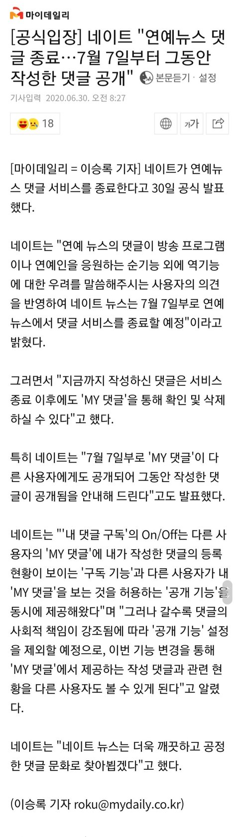 뭐지 분명히 연예뉴스 만 종료한다고 되어있는데 정치니 표현의 억압이니 이런게 갑자기 왜 나와? 애초에 연예뉴스 댓글창이 왜 막혔는데 악플때문에 고통받고 죽는 연예인들 때문에 보호차원에서 시작된건데 뭔.. 네이버보다 더 시궁창같은게 바로 네이트댓글창이었음ㅋㅋ 누가봐도 다 아는 사실을 모른다고 하면 그건 본인이 찔려서겠지 뭐 무심코 네이트 연예기사 봤다가 댓글보고 토나올뻔한적 한두번이 아님