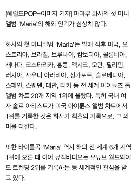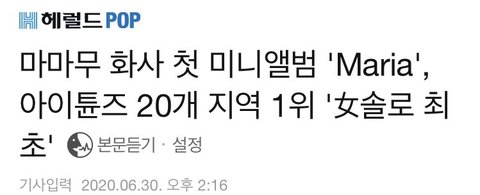 화사 女 솔로 최초 아이튠즈 월드 앨범차트 1위 ㄷㄷ
