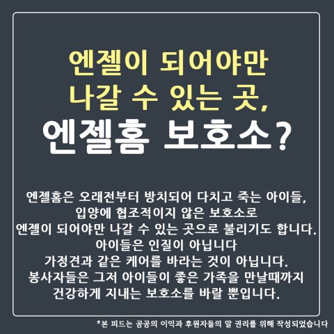 엔젤홈을 도와주세요. 우리 아이들이 엔젤이 되어 보호소를 떠나는 것이 아닌 다정한 보호자님을 만나 꽃길을 걸을수 있도록 아이들을 위해 계속해서 관심을 가져주세요.