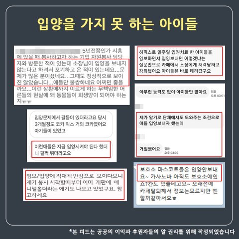 봉사자들은 또 다른 엔젤홈들이 계속해서 생기지 않기를 바랍니다.민간이 운영하는 사설 보호소는 제도상의 사각지대에 놓여있습니다.사설 보호소에 대한 운영 기준, 보호소장에 대한 자격 요건이 부재하며 많은 보호소가 어려움에 처해있기도 하고 동시에 많은 아이들이 ‘보호소에 의해’ 어려움에 처해있기도 합니다.사설 보호소 운영에 대한 조건, 관리에 대한 법적인 제도가 보완되어 아이들이 다치고 죽어가며, 봉사자와 후원자를 우롱하는 사설 보호소가 존재하지 않기를 바랍니다.