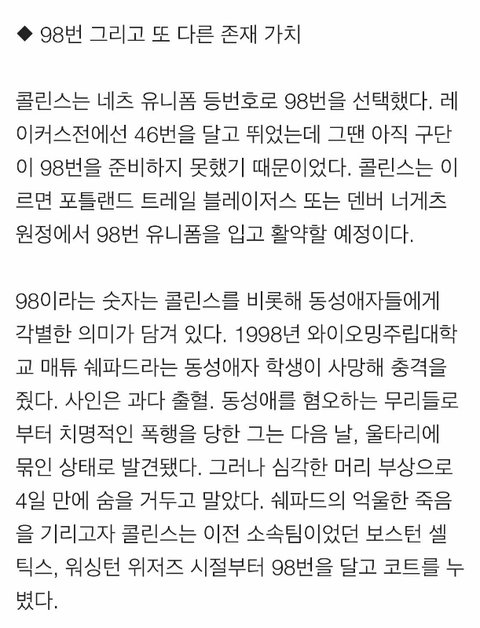 18년 페슽아에서 졍굯이랑 짐읹이만 셀틱스 선수복 입었음. 콜린스 98번으로 뛰었고 세번째 사진이 그 설명.. 일케 의미 있는 번호가 많을텐데 국민의 경우는 33번. 인터뷰 내용 중 33년 동안 오븐에 있었다는 말