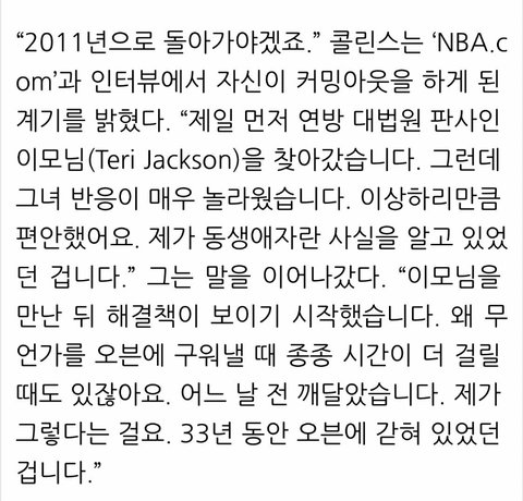 콜린스는 미 프로스포츠 사상 최초로 현역으로서 커밍out 밝힌 선수