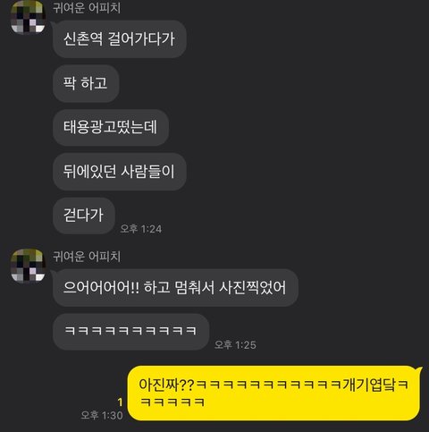 신촌 툥 찍어서 보내줬던 현생 친군데 ㅋㅋㅋㅋㅋㅋㅋ오늘은 이렇게 연락왔엌ㅋㅋㅋㅋ준희들 넘 기엽다◠‿◠
