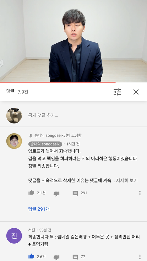 +송대익 사과영상 올라왔는데 진짜 성의없어 보인다 영상에서 주작 맞다고 말함 컴퓨터에 3분도 안 되는 글 적어놓고 그거마저도 못 외워서 계속 옆에 힐끔거리면서 말함