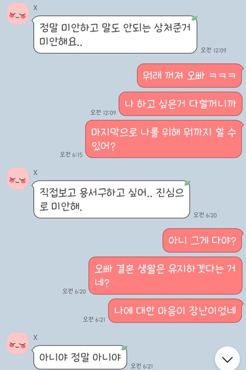 저는 그쪽 남편이랑 다시 잘해보고 싶다는 마음은 추호도 없고 같은 여자로써 알고 있는것이 좋을것 같다고 연락드렸다 했습니다.
