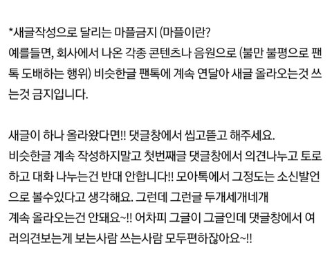 엔터에서, 팬톡은 너희들 스스로 망햇다고 버렸다고 하는 댓글도 마니봤고. 난 txt팬톡이랑 모아톡은 완전 별개로 다르다고 생각하는 모아야. 엔터에서 본 마플글들은 물론 내성향과도 맞지않고.