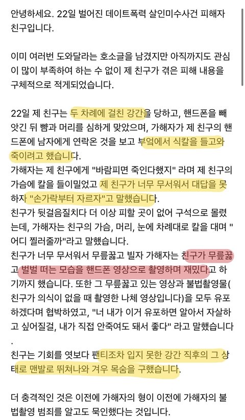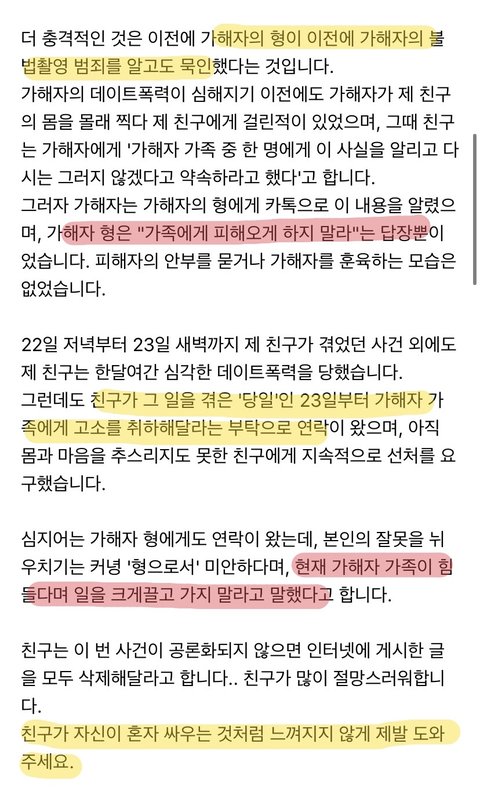 불과 몇 년 전만해도 내 주위 친구들 중 이렇게 데이트 폭력 당하면서도 맨스플레인╋가스라이팅 오지게 당해서 손찌검 당하면서도 그게 잘못된 줄 모르고 만나던 애들 정말 많았다. 헤어지고 나서 정신적으로 피폐해지고 고통속에서 산 아이들. 그런데 지금은 그 몇 년 전이 아니잖아? 2020년에도 이런 일이 일어나서는 안되는 거 아니야? 피해자 분 절대 선처하지 마세요. 모두가 당신의 편이에요. 힘내세요. 이 악 물고 버티고 일 잘 하는 변호사 선임해서 가해자 엄중처벌 받게 해요. 응원 할게요.