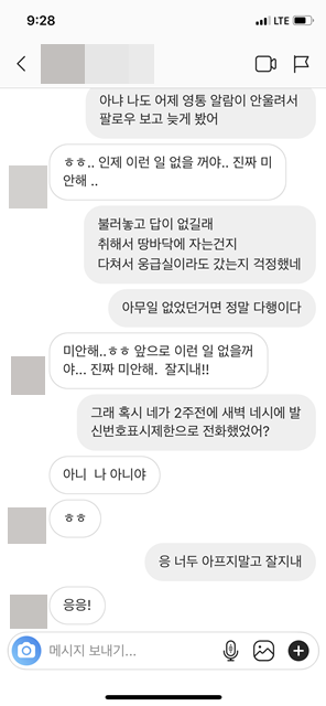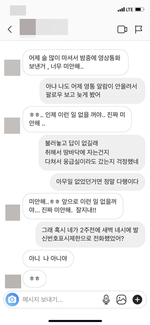 번호는 지웠는지 인스타 계정으로팔로우를 다시 하길래다이렉트 메세지함에 들어가보니친구가 아닌사람한테는 메시지 요청 1건 이렇게 뜨잖아요?거기들어가보니 영상통화 걸고 난리가 났더라구요12시 30분쯤에요 5분마다 영통걸면서 제가 안받으니까제 이름이 민지면