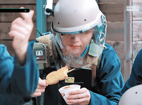 해찬이 헬멧쓰고 오뎅 먹는 짤인데