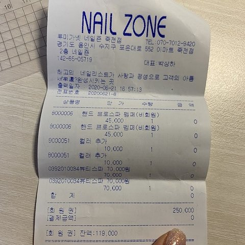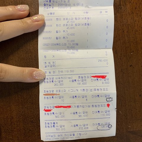 나보고 아트 가격이 한 손가락당 1만원인데 큰 인심쓰듯 7만원에 해줬다. 라고 말하며 영수증을 뽑더라구요.(속으로 좀 헉했지만 그냥 넘겼어요. 이미 서비스를 받았는데 뭘 어쩌겠어요. 끽해야 5-6만원 생각했거든요)