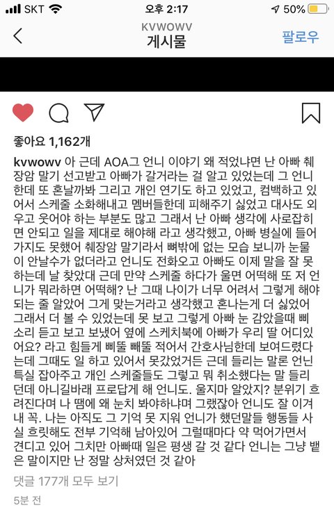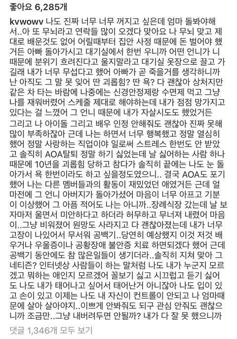 방금 전 aoa멤버 민아 인스타에 이런글이 올라옴
