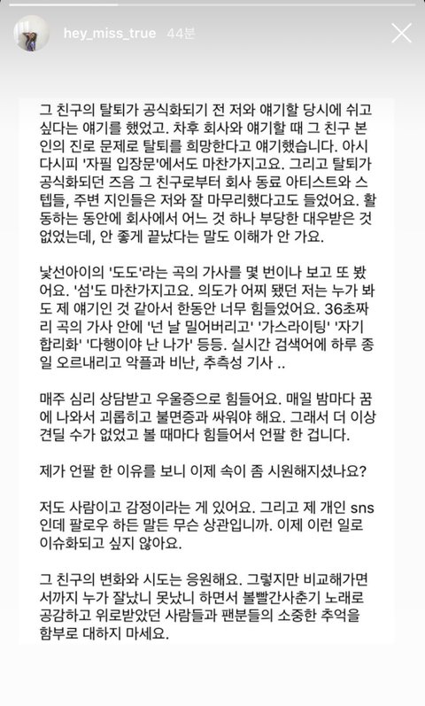 자세한 내막은 탈퇴한 본인만 알겠지만, 글보니 당사자도 모르는걸로 봐서 앞에선 좋게 마무리 하고 뒤에서는 혼자 열등감이 있었던게 아닐까싶음. 오랜친구면서 동료인데 스포트라이트를 받는 사람이 너무 명확하게 정해져있으니까. 안지영 입장에선 나한테도, 스텝들한테도 싫은소리없이 서로 응원해주며 마침표를 잘 찍었다고 생각했는데 솔로앨범곡의 가사를 보고 뒷통수 맞았다 생각했겠지. 나같아도 언짢았을거 같은데