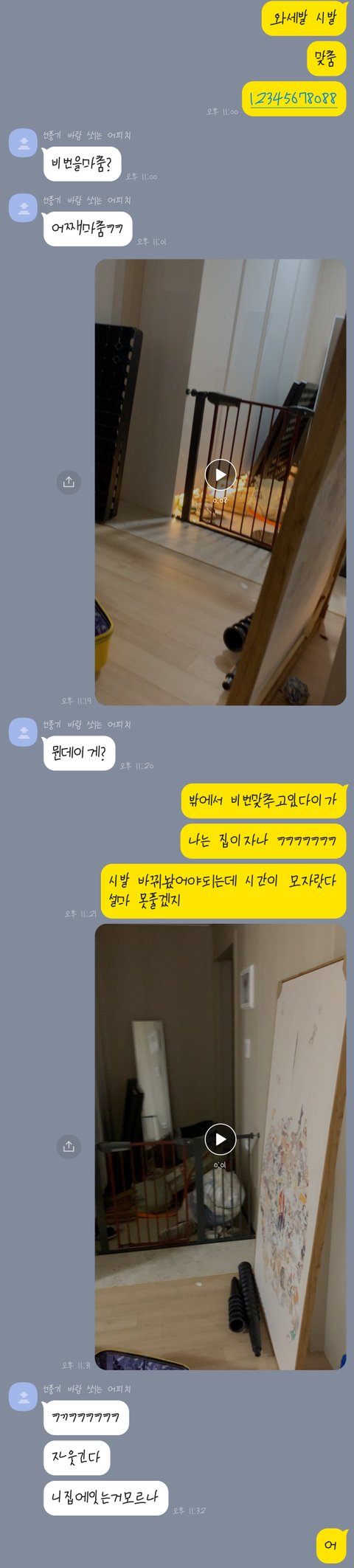 진짜 비번찍다 틀려서 싸이렌 울리는 영상 올리고 싶은데 사진밖에 못올려서 친구랑 톡한캡쳐올림