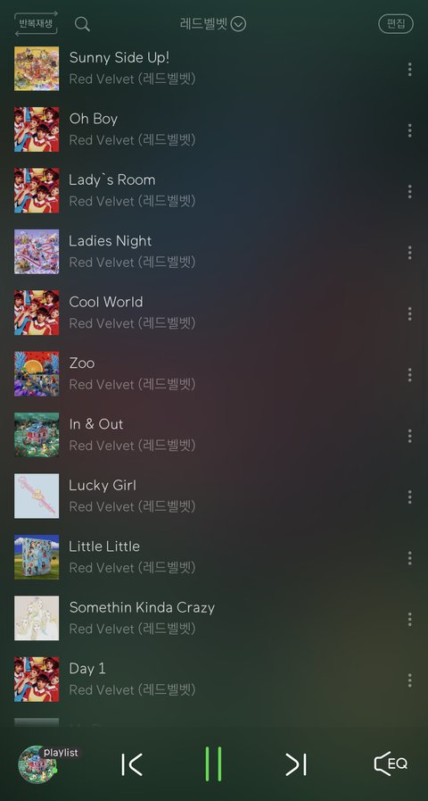 내 실제 플리에 레드벨벳이라고 따로 만들어뒀당.... 띵곡 너무 많아서^^ 사실 본진 입덕을 올해 하기도 했지만 그 전부터 레드벨벳 너무 좋아해서 곡 엄청 자주 들었여!