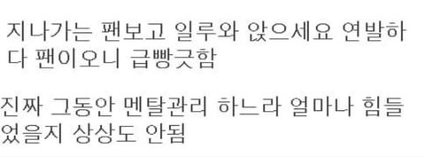 남팬들 진짜 자기가 뭐라도 되는 것처럼 갑질 좀 작작했으면 좋겠다 ㅅ1ㅂ 돈 뭐 한번 갈 때 천만 원 씀? 뭐 팬이니까 훈계한 답 시고 저ㅈ1ㄹ했겠지;; 근데 저건 조카 오지랖인 걸 지들만 몰라ㅠ 제발 너희들 얼굴이랑 성품이나 신경 쓰고 말해라. 아 그리고 특히 청결 문제로 말 많았던 남팬들은 위생까지 신경 써라ㅠ