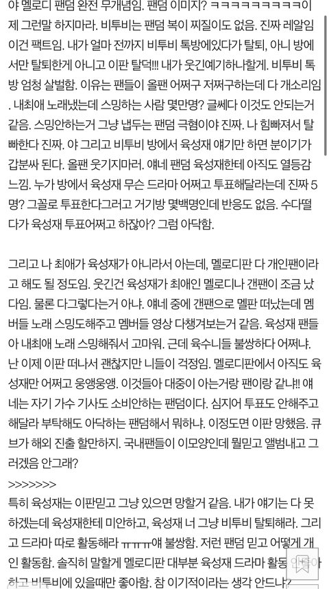 일딴 난 다 사랑하는 멜로디임 아래들 글 말한이유는 특히 성재가 드라마로 인기도 많으니까 악개도 많더라고 ? 성재 노래 칭찬 글에 형들도 잘한다는걸 말하는건 ... 조금 눈쌀찌푸리게 되더라 .. 다 잘하는거 아는데 성재 칭찬글에만 그런게 보이더라고 .. 그리고 무비 팬싸때도 .. 그건 너무 한 것같아 성재 한창드라마로 인기많았을때 배척한걸까 솔직히 갠팬이어도 팬싸왔는데 말 끊는건 아닌 것같아 .. 성재 기분 안 좋아보이더라 당연히 안 좋지 브이앱에서도 몇년쉰다고했을때 나 쉬다오면 최애 바뀌겠지 (?) 이랬나 그때 너무 미안하더라고 자기 최애 올려치기하지말고 다 좋아해줬으면 좋겠다 다 좋아하는 내 연예인인데 멜로디 끼리 싸우니까 슬프다 ! ㅠ 글 읽어줘서 고마워