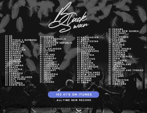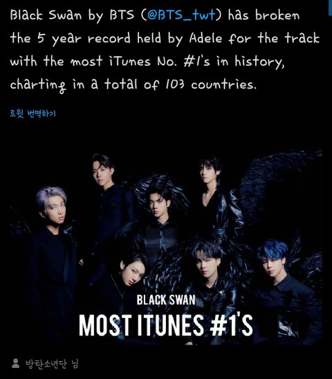 ㅊㅋㅊㅋ아델이 보유한 역대 아이튠즈 1위 트랙 5년 기록을 깨고 방탄 블랙스완 총 103개국 차트 1위에 오름