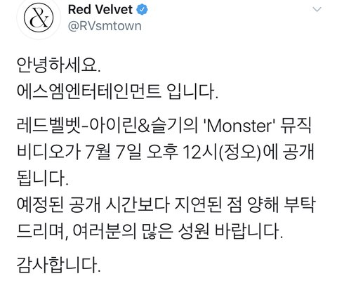 2. 레드벨벳 뮤비 6일 6시공개인데 8시로 미뤘다가 또 7일 정오로 미룸.