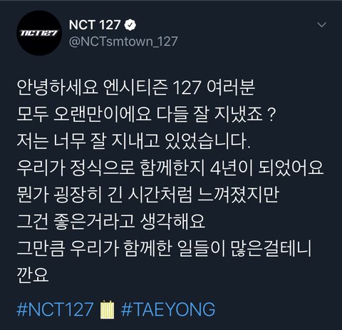 잘 지내고 있었다는 말 그 말만으로도 너무 고맙고 또 미안하고 또 고마워 ㅠㅠㅠㅠㅠㅠㅠㅠㅠㅠ 이태용 너는 진짜 잘 지내야해 앞으로 너도 엔시티도 그리고 우리도 다 행복하기만 했으면 좋겠다 ㅠㅠㅠㅠㅠ고마워 ㅠㅠ
