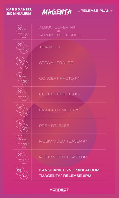 강다니엘 (KANG DANIEL) 2ND MINI ALBUM [MAGENTA] Release Plan: 07/13 Cover Art & PRE-ORDER 07/15 Tracklist 07/17 Special Trailer 07/20 Concept Photo #1 07/22 Concept Photo #2 07/24 Highlight Medley 07/27 Pre-Release 07/29 MV Teaser #1 07/31 MV Teaser #2 08/03 'MAGENTA' Released