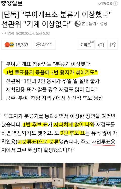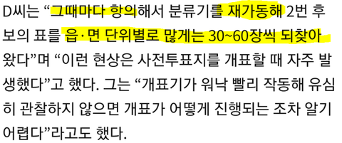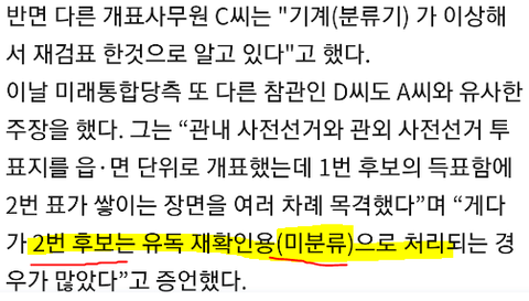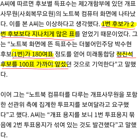 개표 할 때 1번이 너무 많이 나오고 2번은 계속 무효표 되는걸 참관인이 발견함