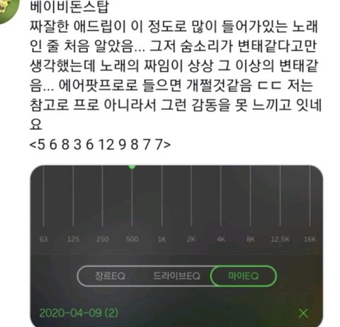 좀 늦게 입덕해서 베돈스 그냥 교차편집이랑 뮤비만 조금...? 보고 제대로 들어본 적 없는데 방금 에어팟 끼고 처음 들었거든 근데 ㄹㅇ 천재같음.... 어떻게 노래를 이렇게 만들지 너무 감탄스러워서 헐레벌떡 팬톡 달려옴 멜롱 댓글에서 봤는데 저 사진대로 설정해서 들어봐 조카좋음ㄹㅇ