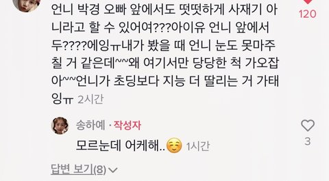 사재기한 건 맞으니까 반박은 못하고 가오잡는 _중딩도 아니고 혼자 뻘소리하는 것 좀 보셈ㅋㅋ얘 때문에 죄없는 박경만 무슨 피해야 박경 뿐만 아니라 수많은 아이돌들 가수들의 노력은 빛도 못보고 수많은 돌팬들도 피해봤는데 지 혼자 피용피용 이지랄 떠는 게 나는 정말......사람이 할 짓인가 싶고........쟤가 이제는 일반인으로 살고 싶은 건가 싶고ㅠ.........그 와중에 빨아주는 초딩들 환멸나고....우리 돌팬들이 힘을 합칠 때가 아닌가 싶어서 올려봄 안 자면 정의구현 좀 해주라 얘들아