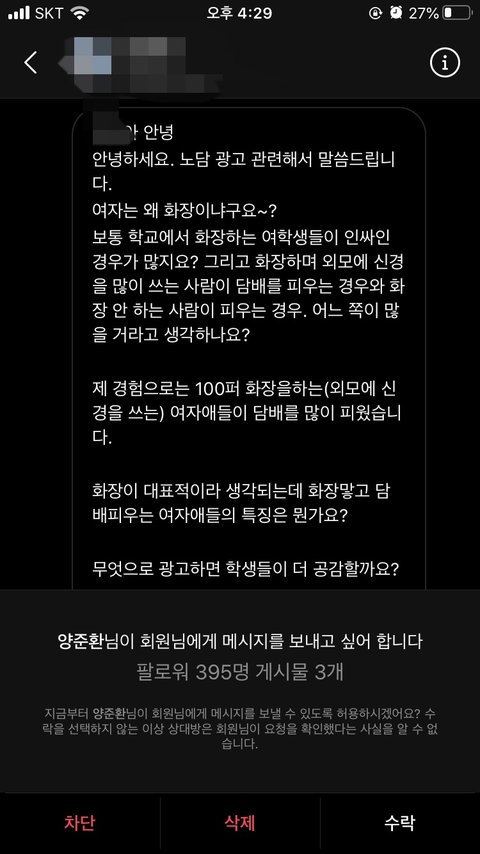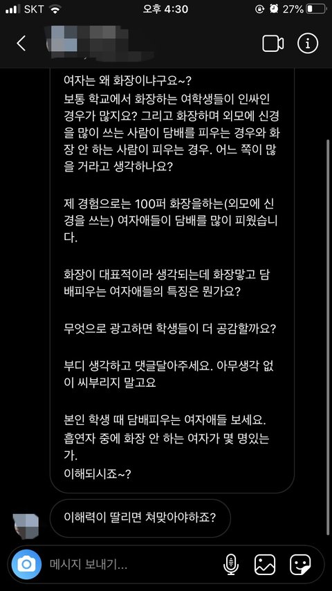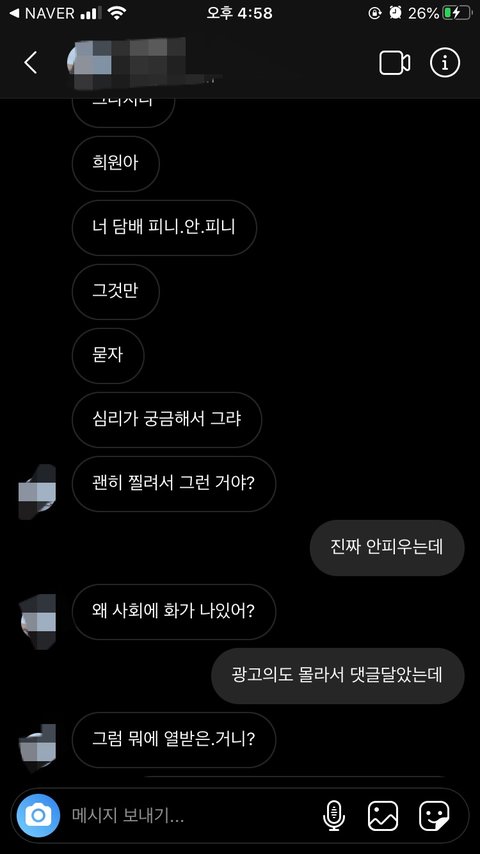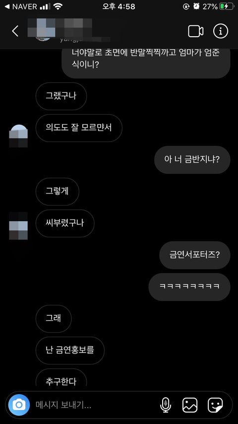 내가 인스타 댓글로 영상 때리고싶단식으로 친구 태그했는데 DM을 보냈더라고 사진 중간에 패드립한거 있어 껄끄러우면 뒤로가기 해