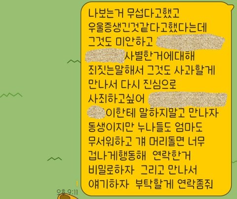 전에 동생이 '이렇게까지 왜끌고와'라고 말했는데 그말은 안받을생각도 있었던것같은데 그럼 다시 벌어진 사이 봉합하면 해결될까요...... 도와주세요.... ㅜㅜ