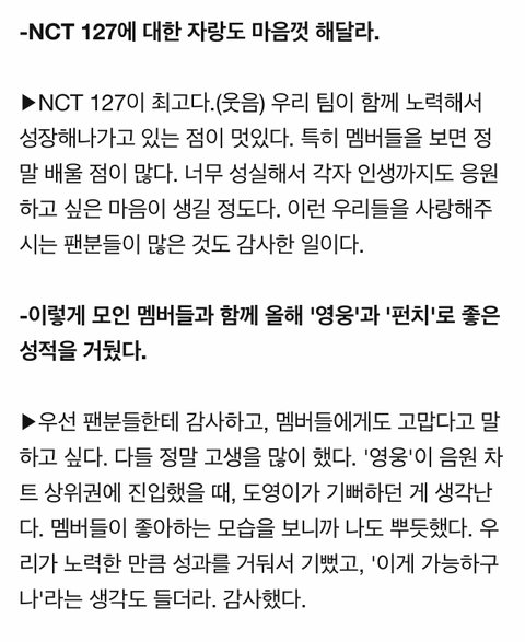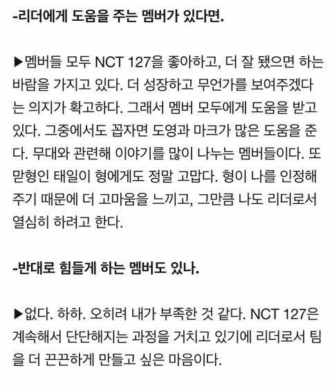 항상 멤버들을 생각하고 팀을 생각한다는게 진심으로 느껴져 127자랑을 맘껏 하라고 할때 멤버들한테 배울점이 많다고 하는거랑 팬분들한테 감사하다고 하는게 정말 너무 고마워 상투적인 대답이라할지라도 옛날부터 꾸준히 해 온 말이라서 더욱 진실되게 와닿기도하고... 그리고 태일이형이 인정해줘서 고맙다는 부분 왤케 찡하지ㅠㅠ 태일이가 맏형으로서 자리를 잘 지켜주는것 같아서 너무 고마운것 같아 ㅠㅠ 무엇보다 힘들게 하는 멤버가 없냐는 물음에 없다라고 오히려 본인이 부족하다고 하는게 참 생각이 깊은것 같아 장난으로라도 누굴 말하지 않는거에서 참 생각이 깊은 리더구나 싶더라