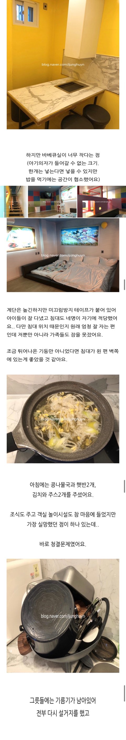 -평소 좋은게 좋은거다 하는 성격이고 후기같은거 쓰는편 아닌데요. 여긴 정말 아니다 싶어 몇자 적습니다. 1박에 60 넘는 가격이면 금액대가 상당히 잇는편인데, 과연 청소나 침구상태가 이 가격이 맞나 싶을정도로 엉망이엇네요. 우선 냉동실은 청소를 아예 안하시는지 성에가 가득차잇어 물건 넣을 공간이 비좁을 정도엿구요. 침대랑 벽사이 공간에도 먼지가 뭉텅이로 굴러다니구ㅜㅜ 침대시트 때문인지 애기 피부 뒤집어지고요. 그리고 이렇게 방음 취약한 숙소는 첨입니다. 옆방 티비소리 생중계하듯 다 들리고요. 침대방 창문으로 외부조명 깜박이는거 수면에 굉장히 방해됩니다. 놀이시설이 다양하고 직원이 친절하면 뭐하나요. 쾌적한 환경에서 편히 쉬고 즐겁게 놀려고 펜션 오는것인데, 돈쓰고 불쾌감 잔뜩 얻어온 여행이었습니다.