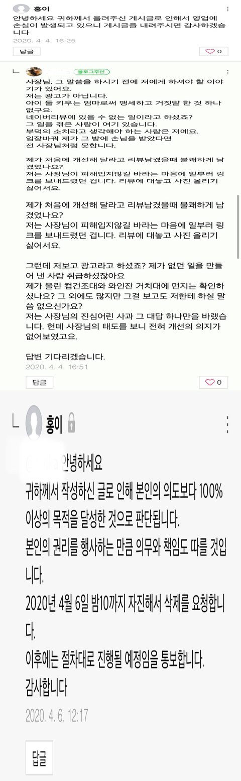 그런데 그 뒤로 업체에서 포스팅을 삭제하지 않을 시 법적처벌이 따를거라는 협박성 댓글이 달렸습니다. 저에 대한 아무런 언급 없이요. 그리고 제가 질문하는 글에는 아무런 답글도 달지 않았습니다. (저를 고소한 지금 시점에는 네이* 리뷰와 제 블로그에 썼던 모든 댓글들을 삭제 한 상태입니다.)