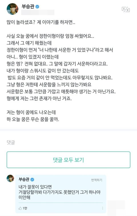 근데 꿈에서 같은팀 멤버 정한이형이랑 싸우는 꿈을 꿈
