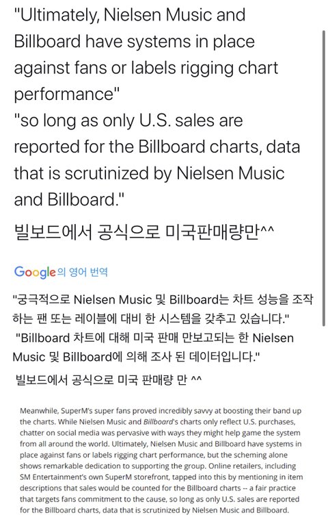 송차트 차트아웃? -> 애초에 슈퍼엠은 대중성을 노리고 나온 그룹이 아님. 특히 데뷔한지 얼마 안 된 신생 그룹이 높은 차트를 얻는 것도 어려운 일임... 또 미국에는 스밍 문화가 전무하고. 스엠의 유구한 마케팅 전략상 절대 대중형이 아닌 팬덤형 그룹으로 조직되었음. 그 결과 실물 앨범 판매량이 높음...