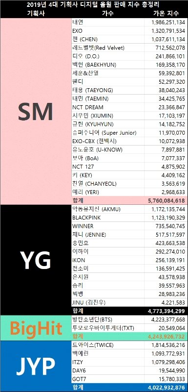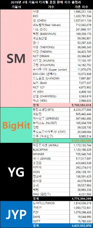 이건 빅히트가 올해 인수하면서 빅히트 레이블로 바뀐 거 간접 체감용 자료! 작년 음원판매 1위 기획사는 SM엔터테인먼트였습니다 짝짝짝