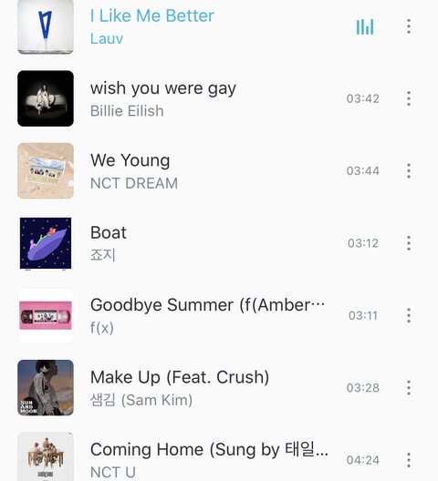I like Me Better은 재현이 커버곡Wish You Were Gay은 도영이 커버곡 Boat는 당연히 정우가 좋아하는거라 Goodbye Summer, Make up은 내가 좋아하기도 하고 애들이 커버해서!!We Young은 여름이기도 하고 더우니까..ㅎ cominghome은 집 가고 싶으니까 마지막으로 골랐어 아니면 애들이 커버하거나 추천한 곡으로 많이할까? 3개 더 해야하는데 추천 좀ㅠ