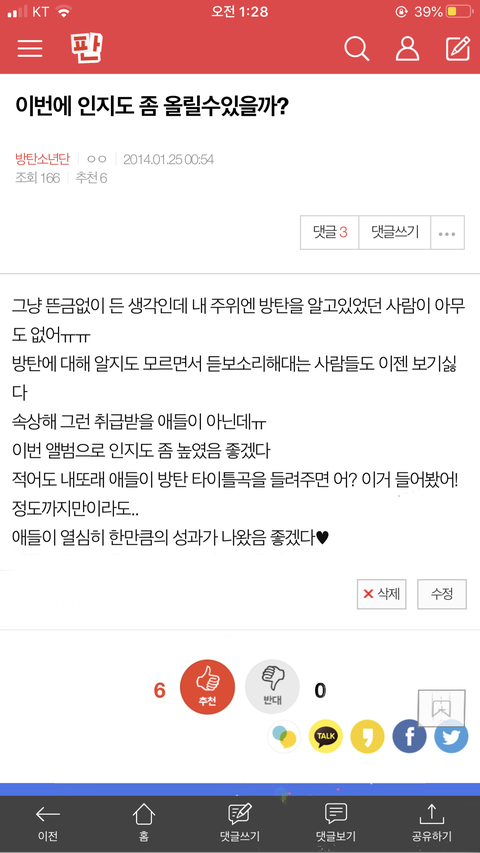 옛날계정 예전에 댓글 너무많이쓰다 정지돼서ㅋ까먹고있었는데 그냥 잠도안오고 추억여행할겸 로그인했다가 이런글있길래 팬톡와봤엉 난 이러고 화양연화직전에 현생때문에 덕질은 포기하고 지금까지 머글로 살고있긴한데 그냥 방탄 저런시절에 덕질하던거 급 생각나서 뭔가 지금 엄청엄청 유명해진게 신기하기도하고(저때는 진짜 속상했다고ㅜ) 지금 아미들은 또 어떤사람들일지 어떤 분위기일지 궁금하기도해서 그냥 구경와봤어 여전히 재밌게 지내는거같네 아무튼 행덕하고!가끔 뉴스로볼때마다 신기하고 뭔가 마음이 시큰시큰하다ㅋㅋㅋ앞으로도 방탄소년단 오래오래 잘될수있게 너희들이 꼭 함께해줘(너무 주제넘은말인가)나도 멀리서 응원한다 안뇽!