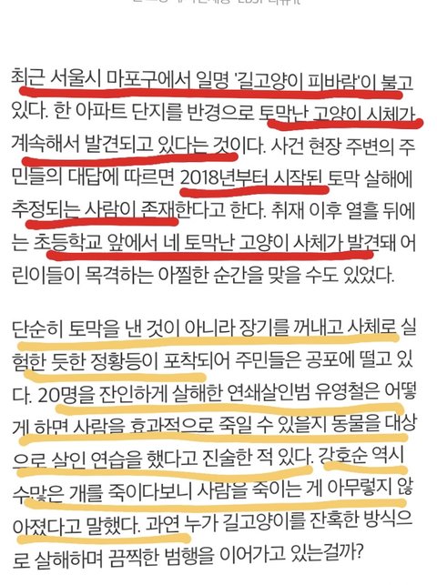 1. 2018-현재 마포구 일대에서 길고양이 토막사체 잇다라 발견