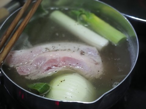 먼저 물에 마늘 양파 파 쌈장 후추 생강가루 소주 넣고 푸욱 삶아줍니다. 저는 40분 삶았습니다.